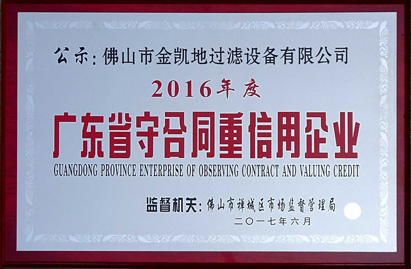 无论当下的社会如何追求效率与服务态度,对于一个企业来说,信用都是最为重要的品质。一个企业的信用并非依靠三两客户就能建立,尤其是对于一些有着十年甚至数十年历史的企业来说,信用更是通过不断的日积月累得来的。近日,佛山市金凯地过滤设备有限公司顺利通过广东省工商行政管理局的考核公示,被授予“2016年度,广东省守合同重信用企业”称号,以表彰其在守信经营方面的优秀表现。
